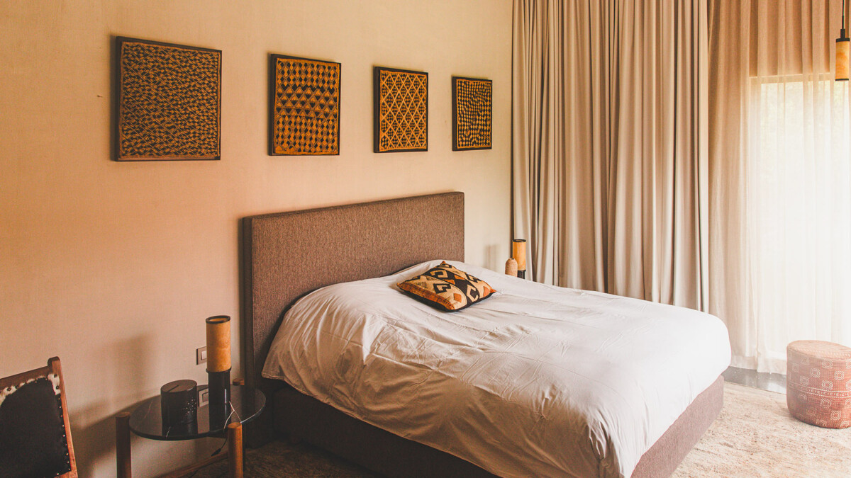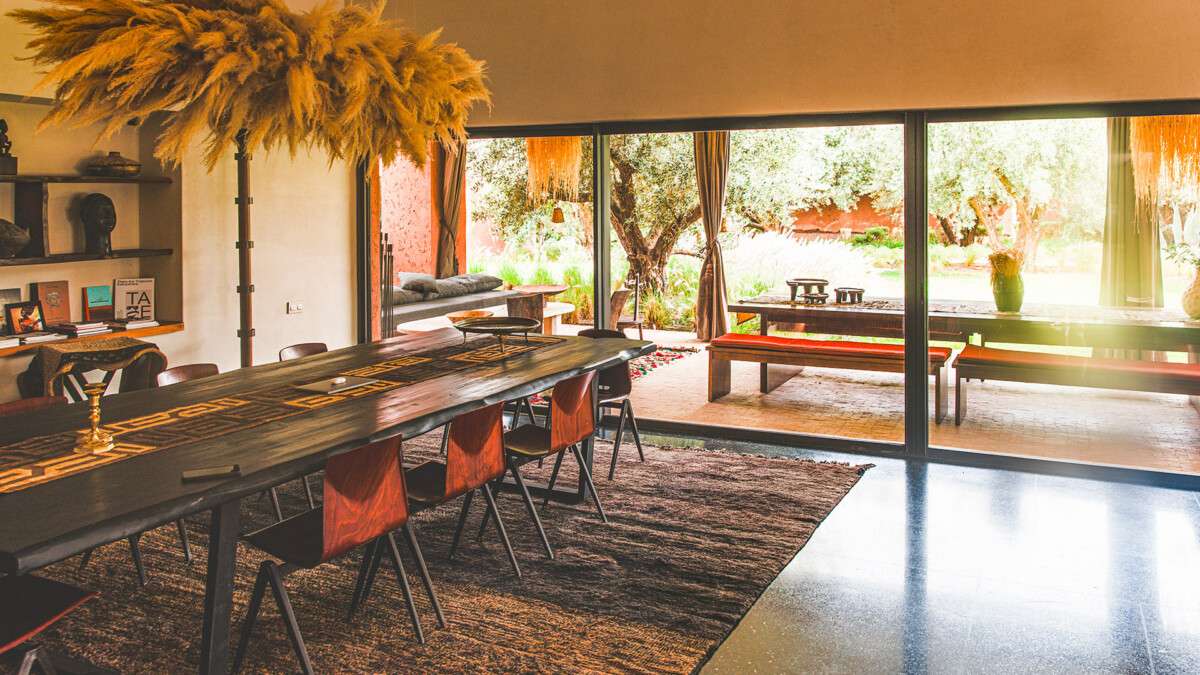 Le cœur de la villa est un vaste espace de séjour ouvert, où salon et salle à manger se fondent harmonieusement. Les grandes baies vitrées baignent les intérieurs de lumière naturelle, créant une atmosphère aérée et accueillante. Le décor mélange modernité et tradition, avec des touches de bois, des motifs marocains et des œuvres d’art locales, évoquant l’élégance à chaque coin. Une cuisine moderne complète cet espace.