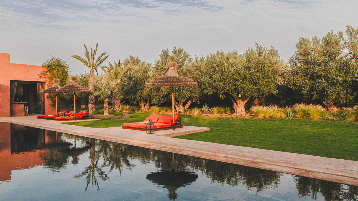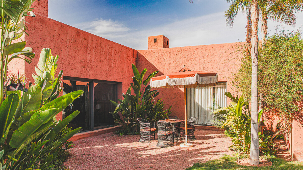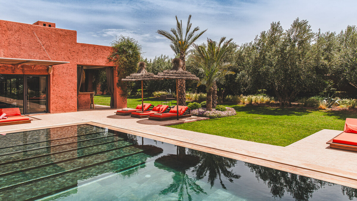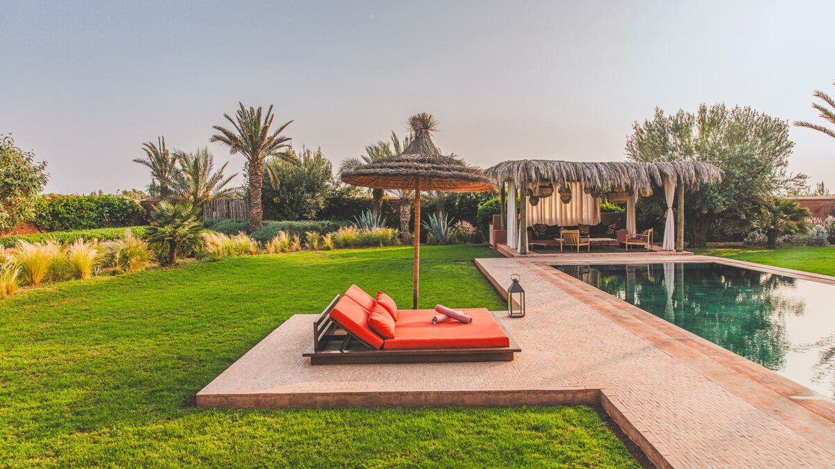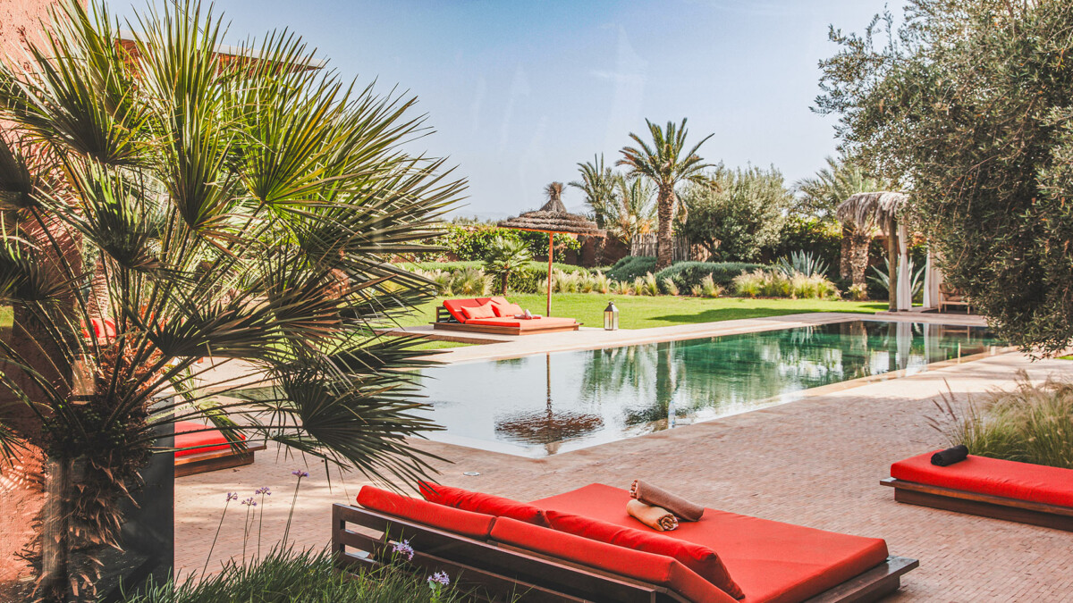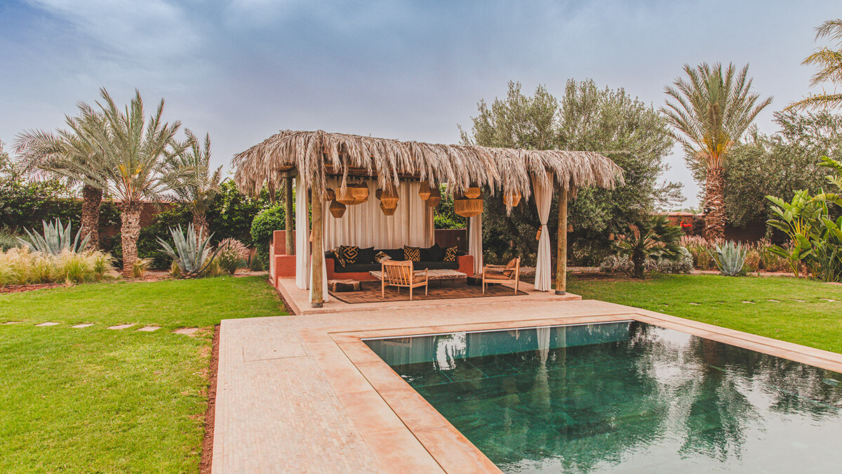 Les extérieurs sont un véritable havre de paix. La terrasse aménagée comprend un salon extérieur, un bar, des transats et une grande table à manger, idéale pour savourer des repas sous le soleil de Marrakech. La piscine (18x5m; profondeur : 0,10-2,3m) pouvant être chauffée, entourée de végétation luxuriante, offre un cadre idyllique pour se détendre. Le jardin, avec ses arbres matures et ses fleurs colorées, invite à des moments de contemplation et de sérénité.