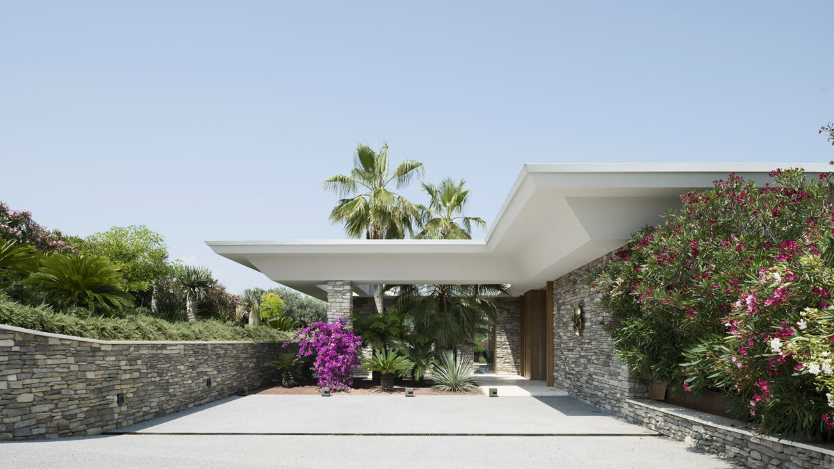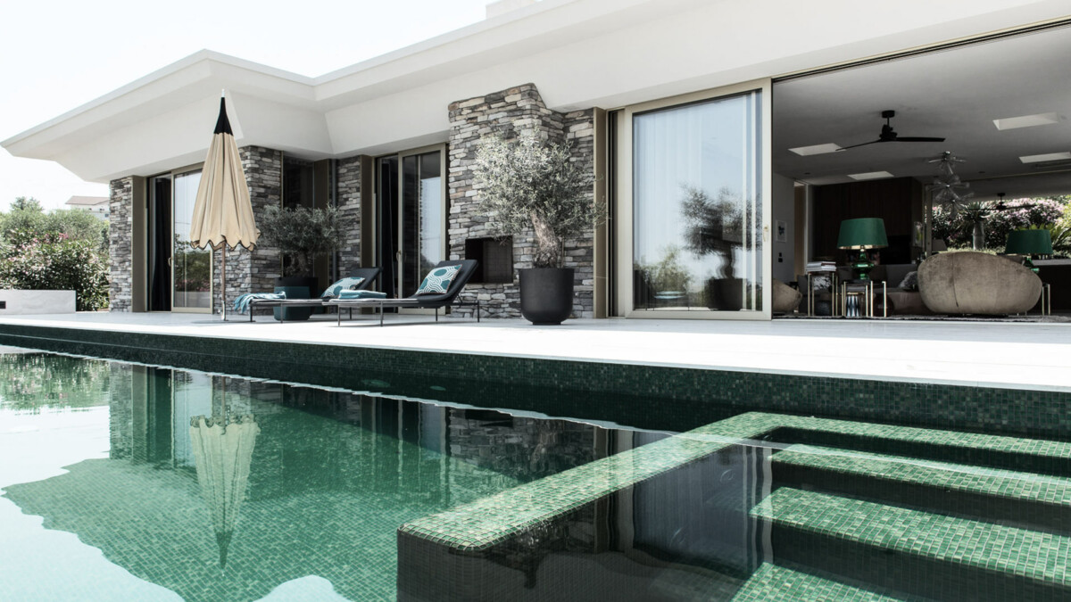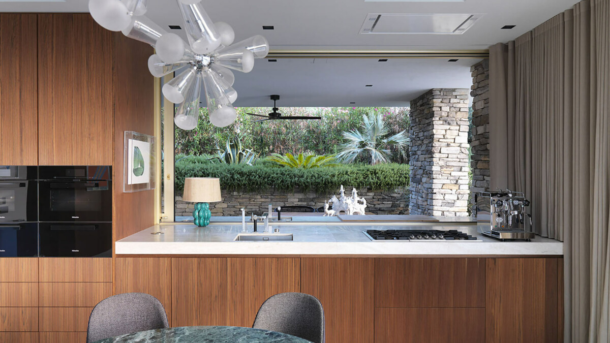 L’intérieur de la villa est un hommage au style des années 50, avec un revêtement mural en noyer et des meubles conçus par Rizzo. L’espace de vie ouvert comprend un salon accueillant, une salle à manger conviviale et une cuisine entièrement équipée avec des appareils modernes, permettant de préparer des repas gastronomiques dans un cadre élégant. Les puits de lumière et les nombreuses ouvertures créent une continuité fluide avec l’extérieur.
