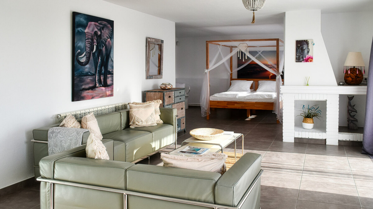 Chambre, 2ème étage, vue sur la mer, dans un autre bâtiment. La chambre propose 1 lit double 180 cm à baldaquin. Salle de bain à l’extérieur de la chambre, privée, avec douche. La chambre inclut également : balcon privé.
